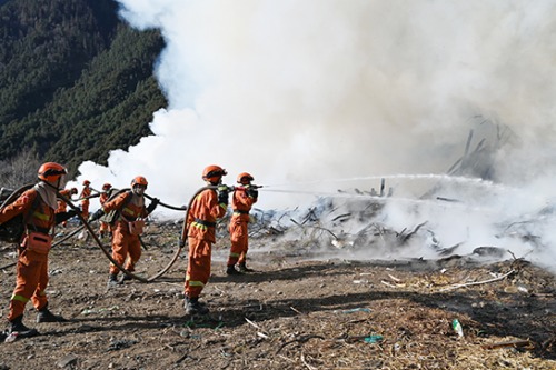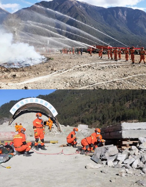 模拟演练背景:12月13日09:50,林芝市巴宜区觉木路附近两座高压输电塔因地震导致倾倒,电线短路瞬间引发了森林火灾,熊熊燃烧的大火在林间蔓延。因地震造成周边地区部分房屋倒塌,道路、桥梁损毁,通信和电力中断,地面救援困难重重。