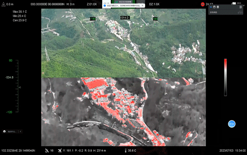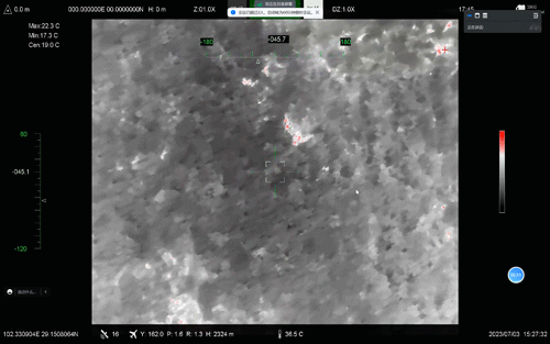 傲势XC-25无人机搭载三光吊舱(可见光、红外光、激光),对现场大范围区域进行空中侦察,使用热成像配合可见光对可疑热源目标进行解析,将吊舱画面实时传输至公安指挥中心,辅助指挥组调度和监控。