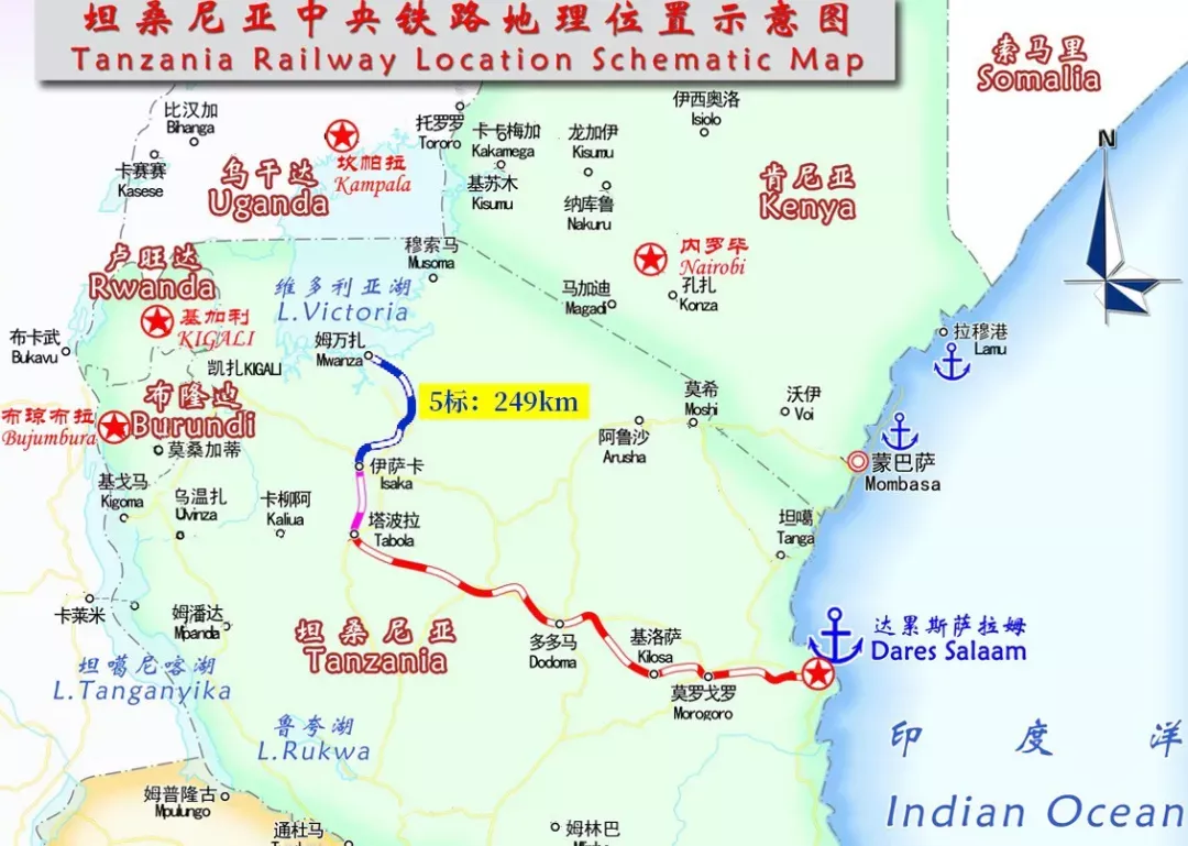 正线全长249千米,连接北部重镇伊萨卡至坦桑尼亚第二大城市姆万扎,将与世界第二大淡水湖维多利亚湖水运相连通,实现“水陆联运”。