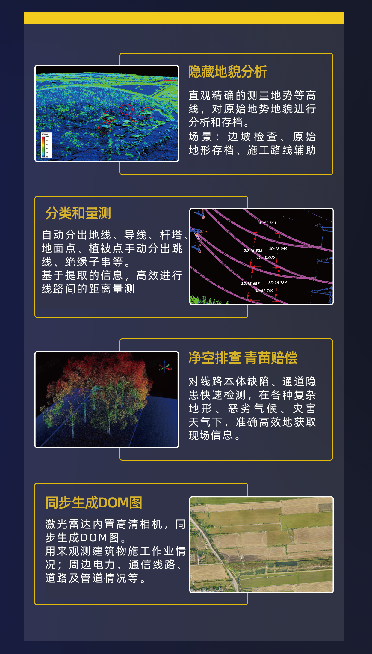 X-Chimera双头龙是国内鲜有能搭载1350m激光雷达航时2小时的无人机,用更好的点云密度,实现更高的成果质量;后期自动生成巡检报告,实现智能化电力巡检。